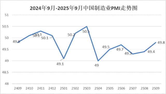 国家统计局服务业调查中心、中国物流与采购联合会发布的2025年9月份中国制造业采购经理指数(PMI)为49.8%,比上月上升0.4个百分点。