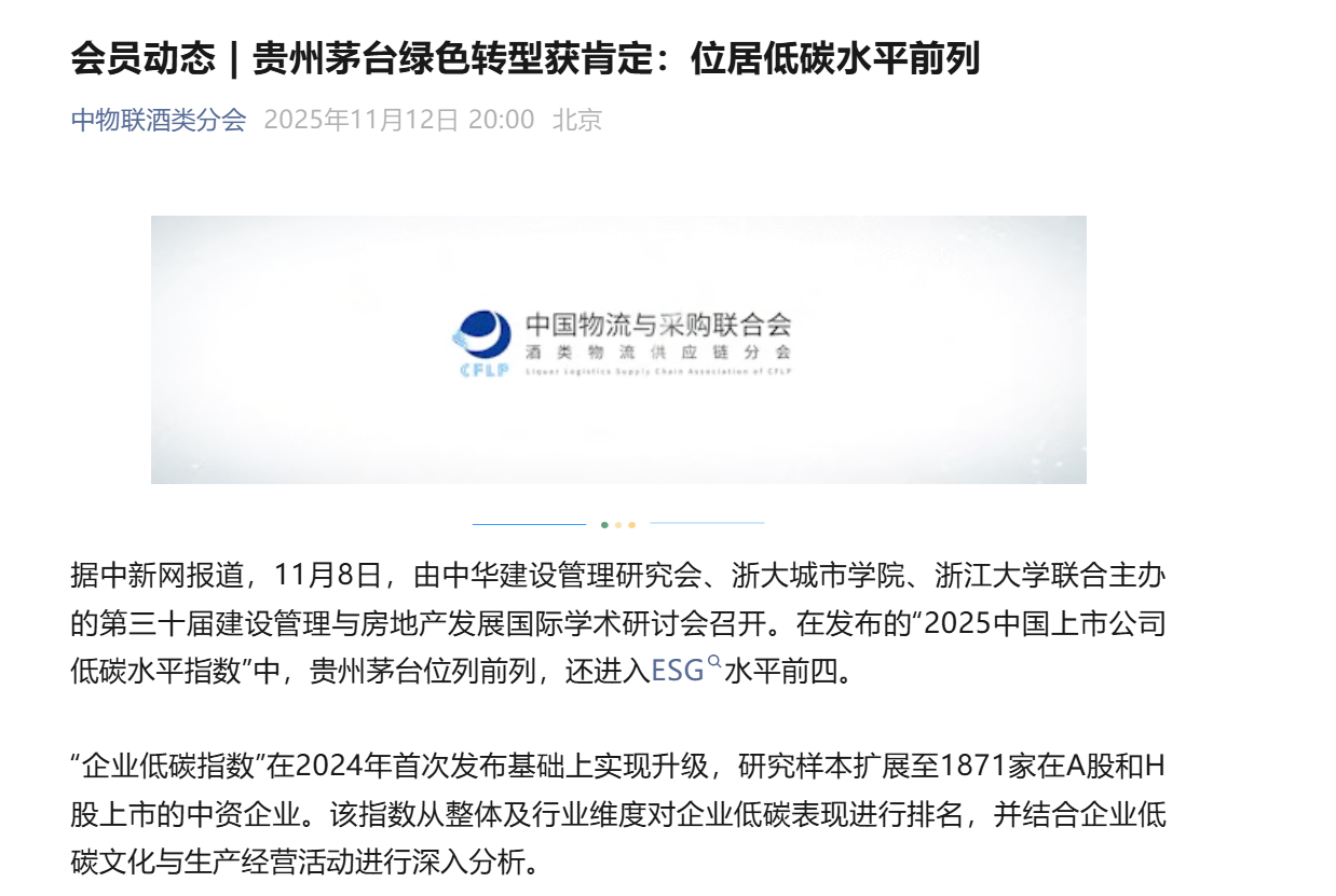 据中新网报道,11月8日,由中华建设管理研究会、浙大城市学院、浙江大学联合主办的第三十届建设管理与房地产发展国际学术研讨会召开。在发布的“2025中国上市公司低碳水平指数”中,贵州茅台位列前列,还进入ESG水平前四。