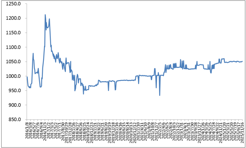 本周(2025年11月17日-2025年11月21日),由中国物流与采购联合会和林安物流集团联合调查的中国公路物流运价指数为1050.75点,比上周回升0.01%。