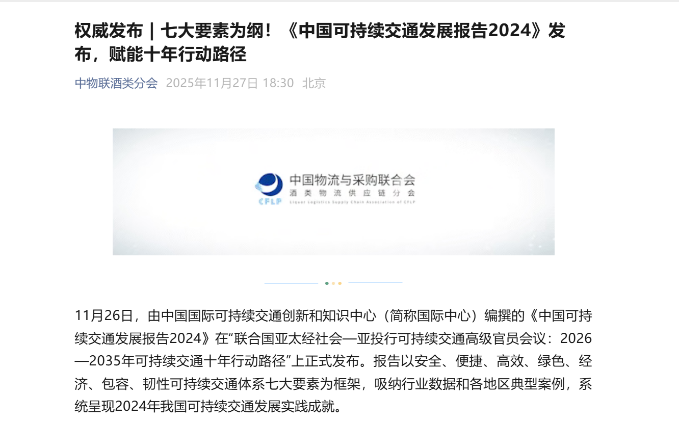 11月26日,由中国国际可持续交通创新和知识中心(简称国际中心)编撰的《中国可持续交通发展报告2024》在“联合国亚太经社会—亚投行可持续交通高级官员会议:2026—2035年可持续交通十年行动路径”上正式发布。报告以安全、便捷、高效、绿色、经济、包容、韧性可持续交通体系七大要素为框架,吸纳行业数据和各地区案例,系统呈现2024年我国可持续交通发展实践成就。